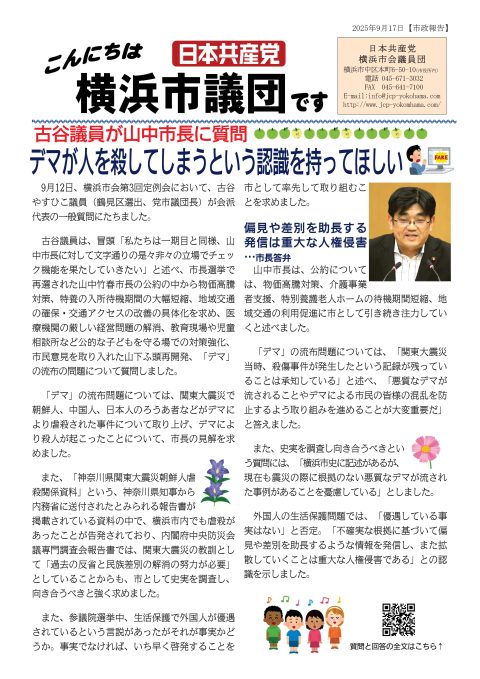 9月12日、横浜市会第3回定例会において、古谷やすひこ議員(鶴見区選出、党市議団長)が会派代表の一般質問にたちました。